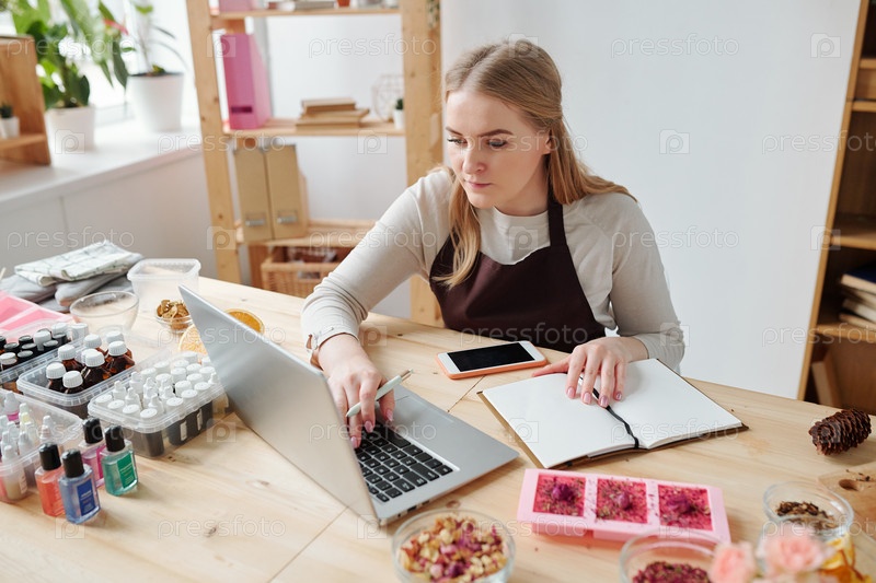 Красивая молодая креативная женщина в фартуке, сидящая на рабочем месте перед ноутбуком