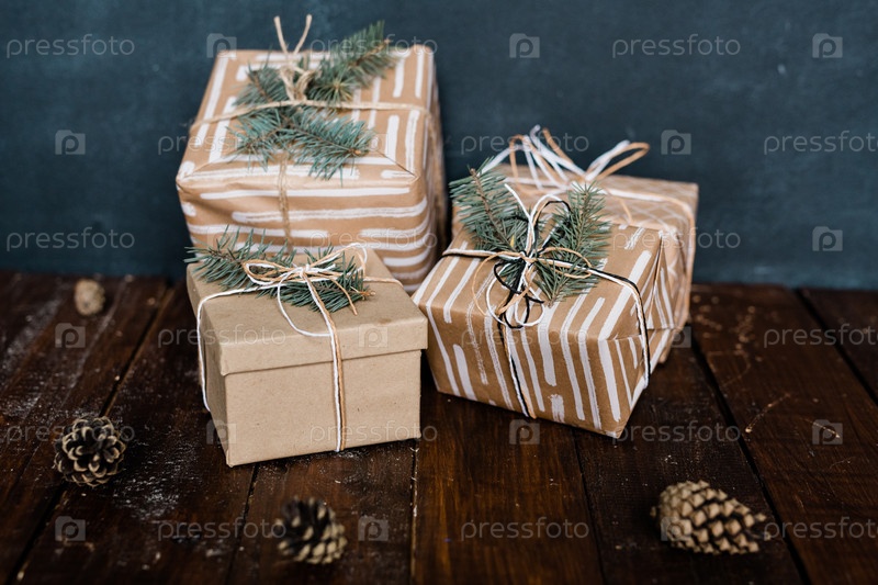 Упакованные и завернутые коробки для подарков с хвойными деревьями наверху и несколькими сосновыми шишками рядом
