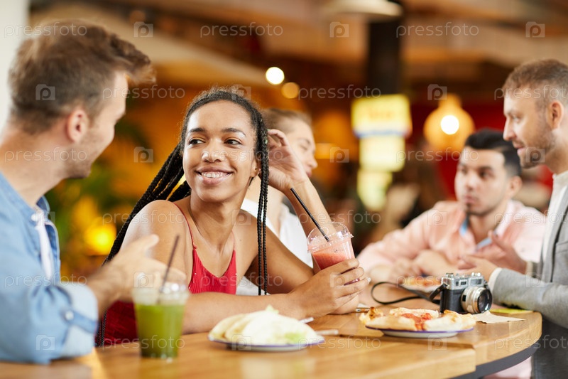 Группа веселых молодых студентов из разных этнических групп, сидящих за стойкой в современном кафе и обсуждающих факультативные предметы
