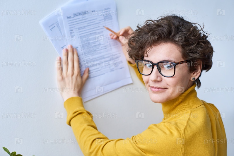 Гипстерская леди заполняет налоговые документы на стене