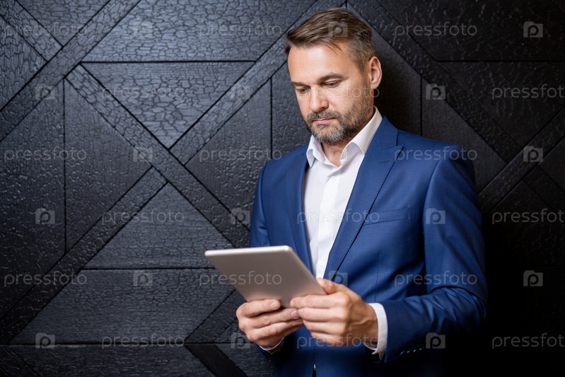 Серьезный элегантный бизнесмен средних лет в формальной одежде, концентрирующийся на удаленной работе