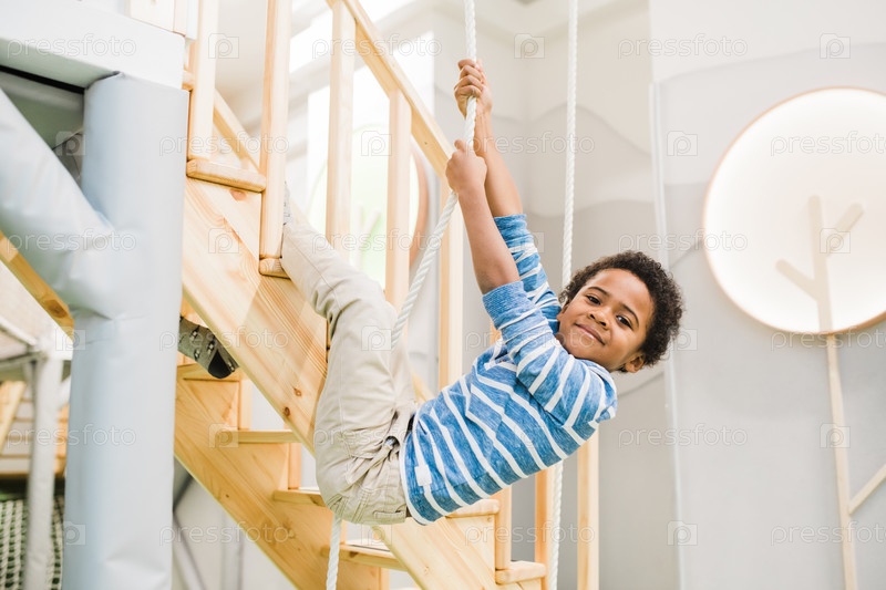 Счастливый милый мальчик африканской этнической принадлежности, держащийся за веревку во время игры