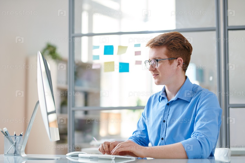 Молодой уверенный в себе программист смотрит на компьютерный монитор во время работы