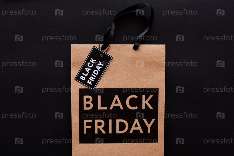 Близкий план бумажного пакета для покупок с меткой в черном цвете, реклама Черной пятницы