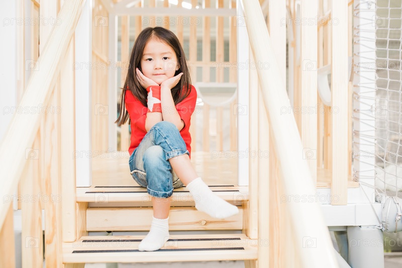 Очаровательная азиатская девушка в повседневной одежде сидит на деревянных лестницах в игровой зоне
