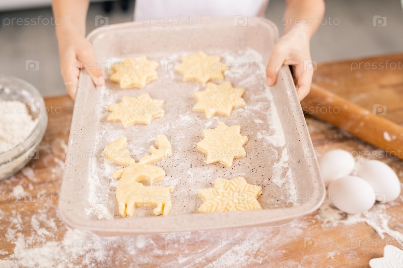 Руки женщины, держащей поднос с сырыми печеньями над кухонным столом перед выпечкой