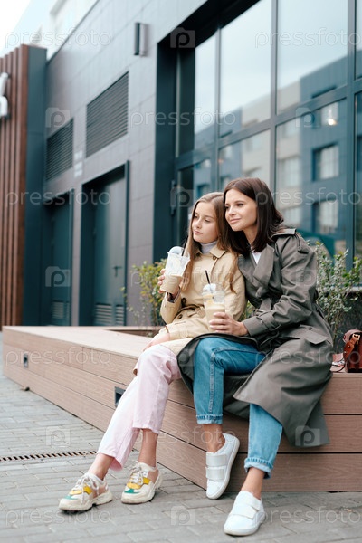 Две спокойные женщины в стильных повседневных костюмах выпивают, отдыхая на свежем воздухе