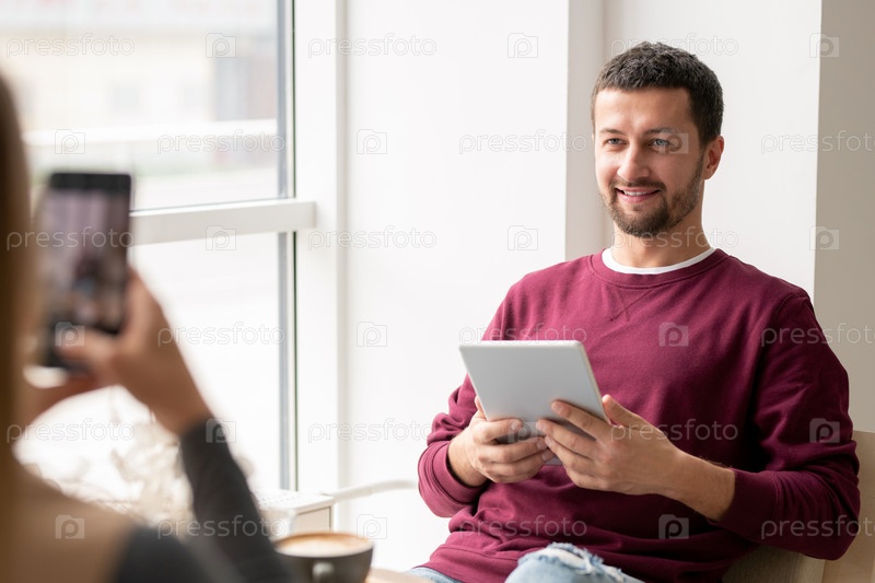 Молодой человек в повседневной одежде смотрит на девушку, фотографирующую его со смартфона