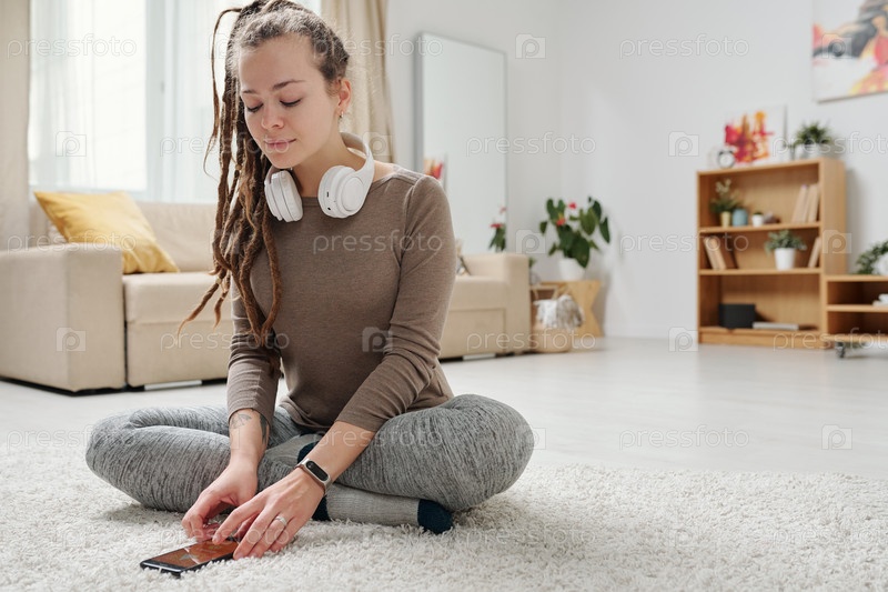 Красивая девушка с наушниками собирается слушать аудио йоги на смартфоне