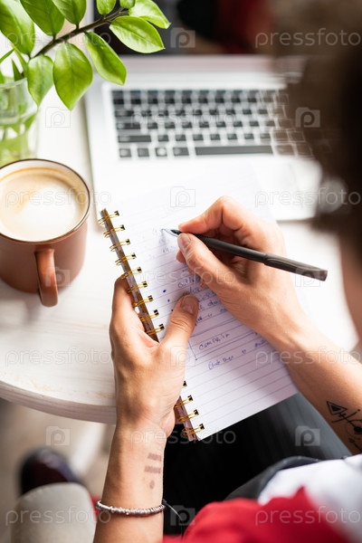 Молодая руководительница делает заметки в блокноте, организуя работу