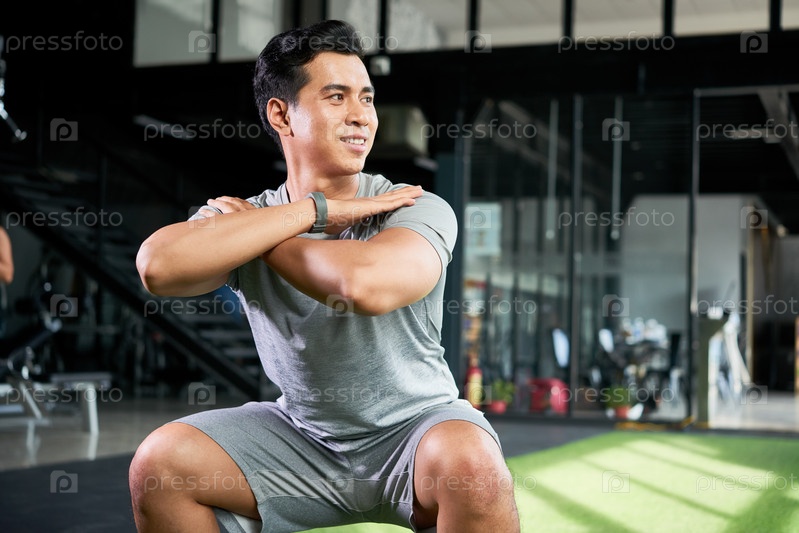 Веселый мужчина занимается в тренажерном зале