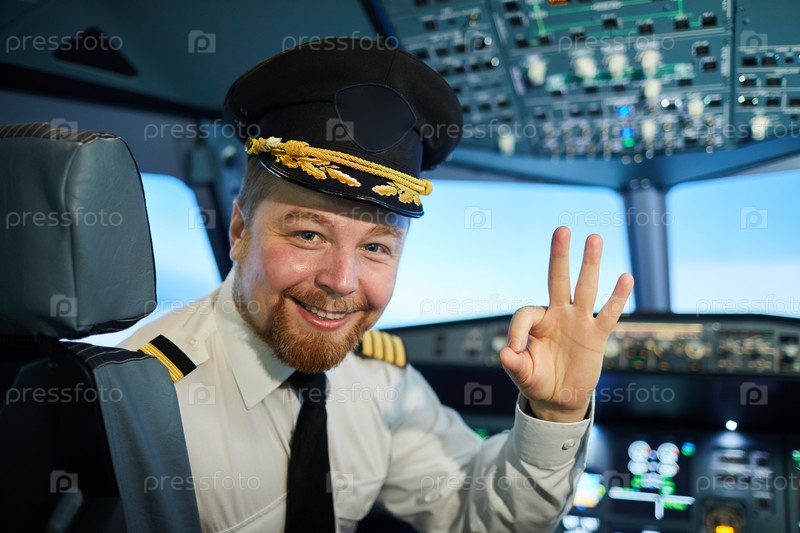 Позитивный капитан пассажиров самолет, показывающий знак OK