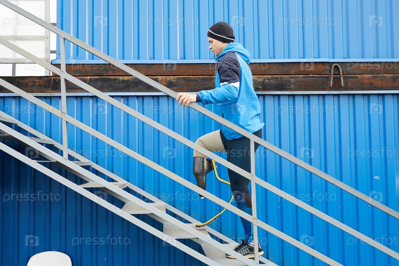 Решительно настроенный молодой мужской бегун с искусственной изогнутой ногой поднимается по наружной лестнице и использует перила для поддержки