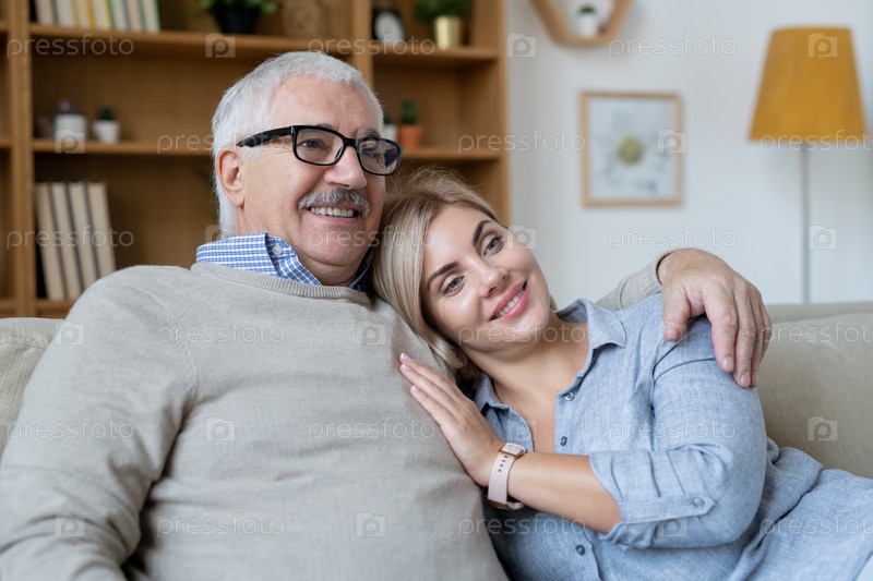 Молодая улыбающаяся женщина кладет голову на плечо своего старшего отца, обнимающего ее