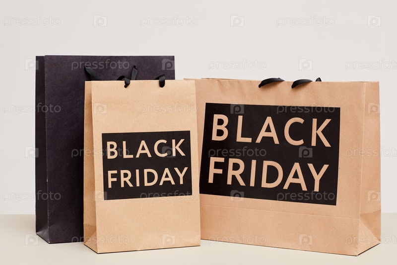 Близкий снимок экологических бумажных пакетов Черной пятницы для упаковки в магазине, концепция покупок