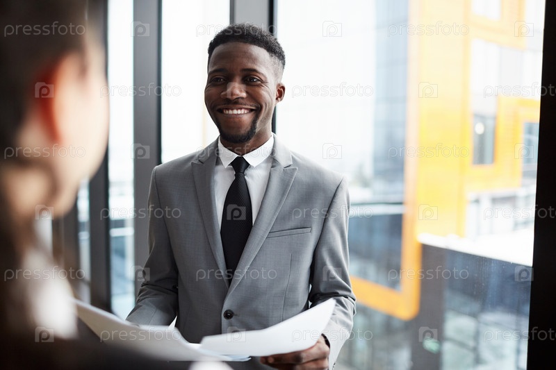 Улыбающийся чернокожий мужчина общается с коллегой по работе
