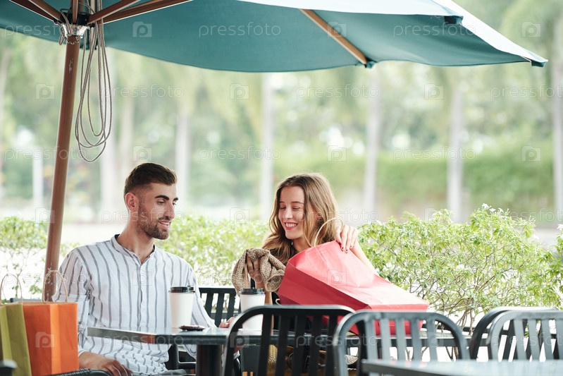 Женщина показывает покупки мужу