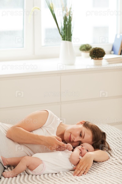 Спокойная молодая женщина лежала на кровати и смотрела, как ее очаровательная дочь сжимает ей палец