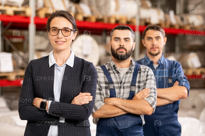 Красивый руководитель рабочей команды и два инженера, скрестившие руки за грудь