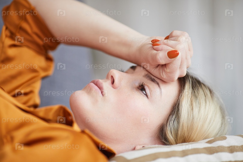 Близкий план серьезной молодой женщины с светлыми волосами, лежащей на подушке и страдающей депрессией