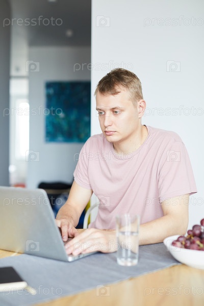 Серьезный парень смотрит на дисплей ноутбука во время просмотра в сети