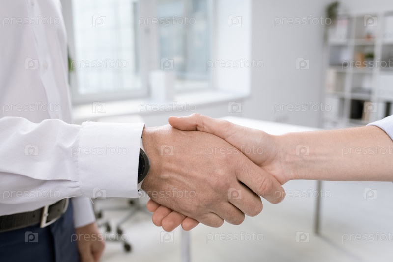 Руки успешных деловых партнеров, поздравляющих друг друга с новой сделкой
