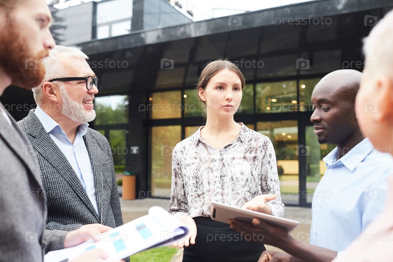 Группа деловых людей, обсуждающих работу на свежем воздухе