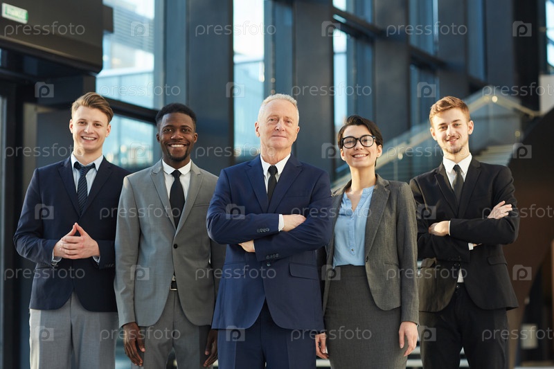 Веселые профессиональные бизнесмены, позирующие в группе