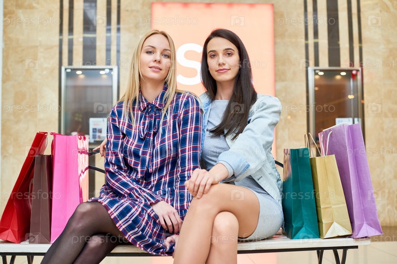 Красивые дамы сидят на скамейке с сумками для покупок