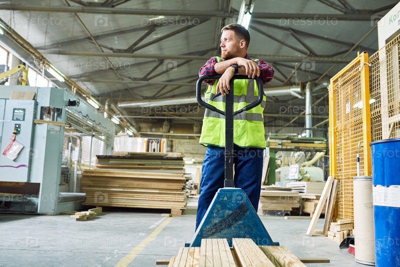 Молодой человек перемещает доски на складе