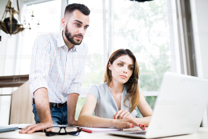 Два современных бизнесмена, использующих компьютер в офисе