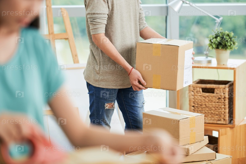 Пара переезжает картонные коробки в новую квартиру