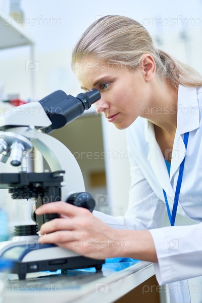 Учёная-женщина, использующая микроскоп