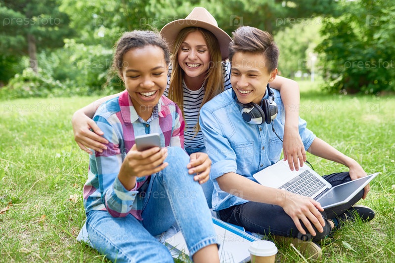 Счастливые студенты наслаждаются перерывом на зеленом газоне