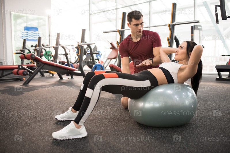 Фитнес-инструктор помогает молодой женщине