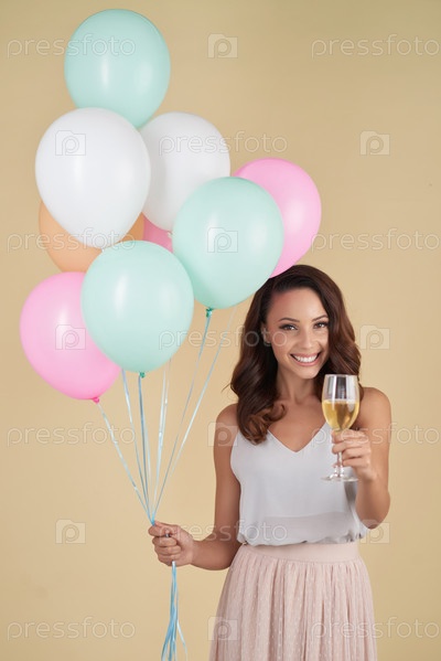 Взволнованная девушка с воздушными шарами поднимает бокал