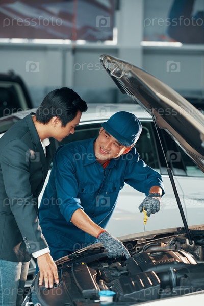 Владелец автомобиля и механик на мастерской