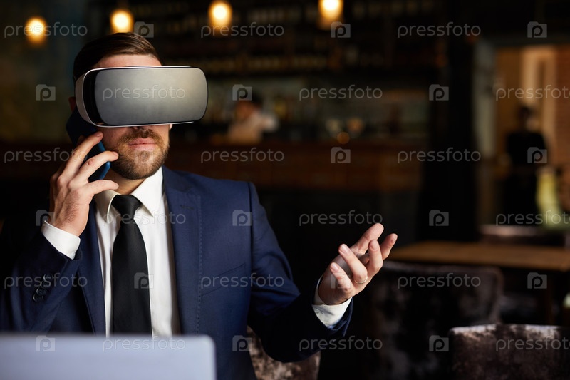 Современный бизнесмен в гарнитуре VR разговаривает по телефону