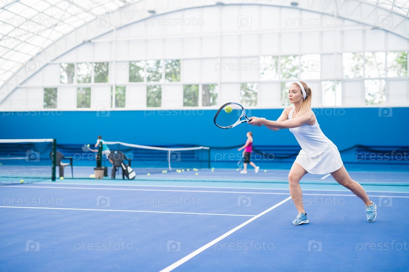 Блондинка играет в теннис Акционный снимок