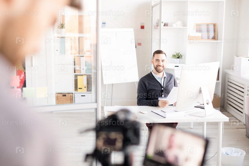 Улыбающийся офисный работник позирует