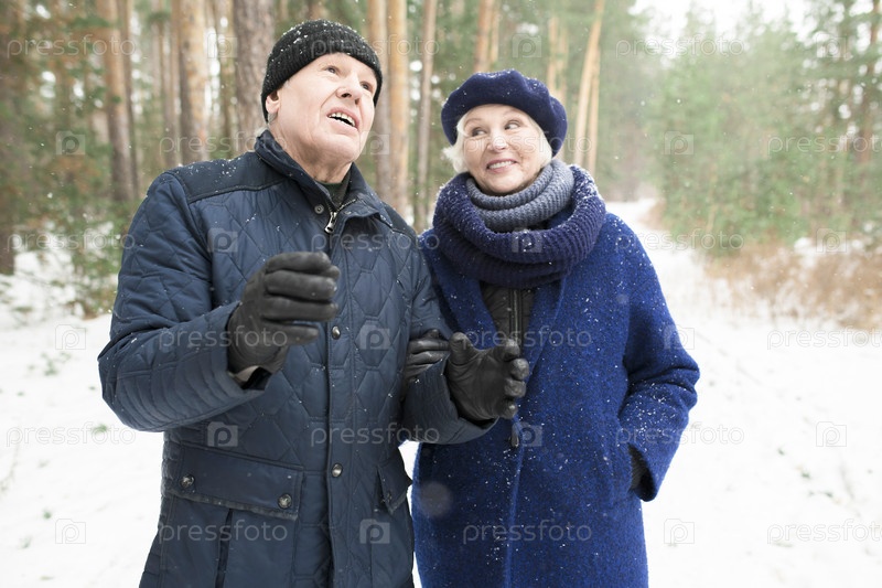 Старшая пара, гуляющая по зимнему лесу
