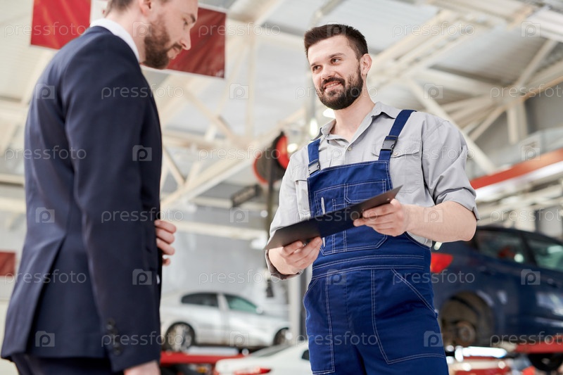 Улыбающийся механик дает контракт клиенту