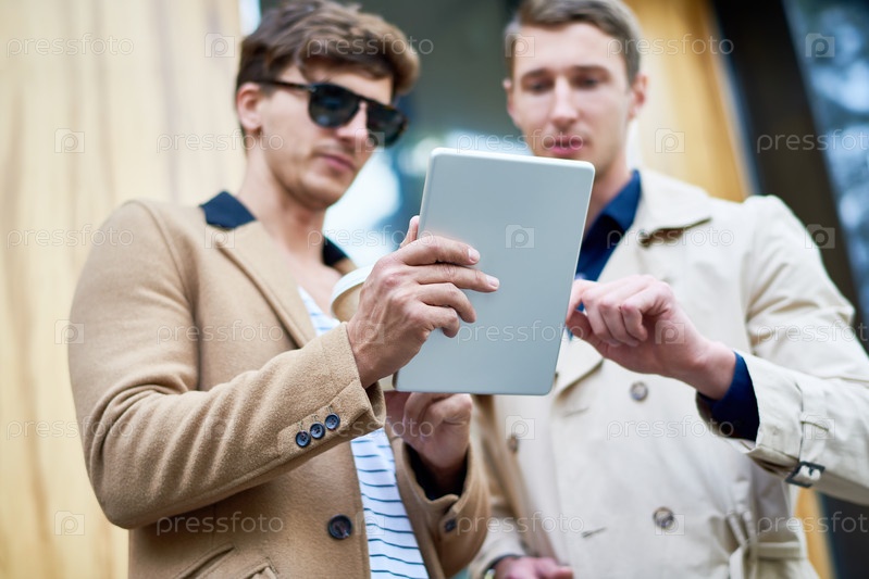 Два бизнесмена, использующие планшет на улице