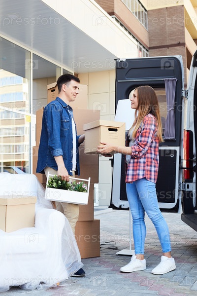 Пары разгружают перемещающий фургон