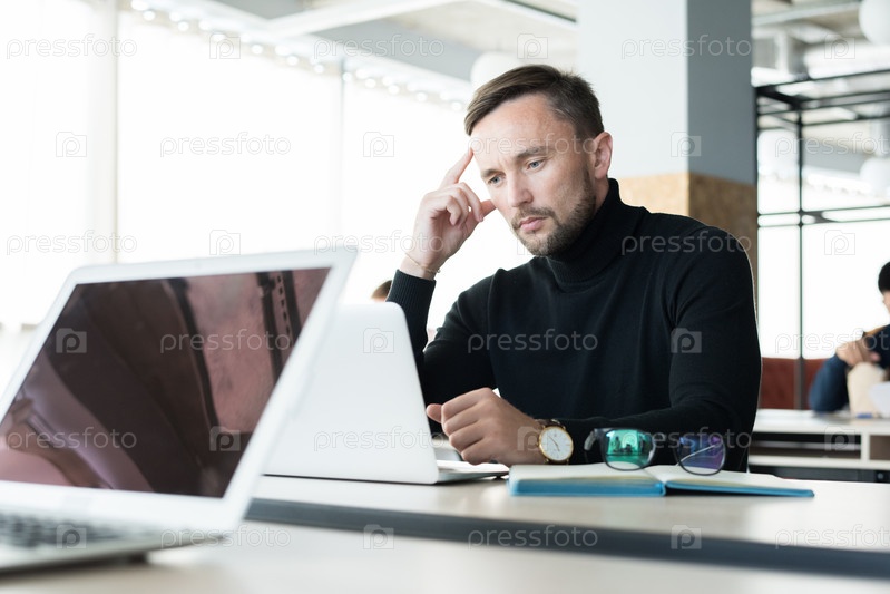 Вдумчивый мужчина, использующий ноутбук в офисе