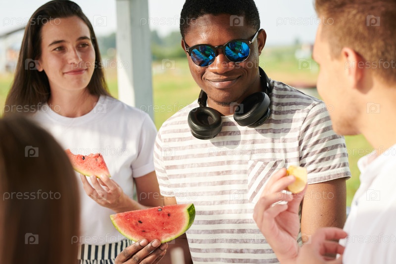 Люди, которые едят фрукты на свежем воздухе