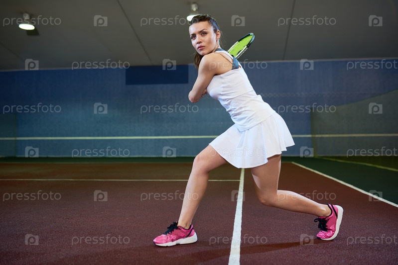 Энергичная молодая женщина играет в теннис