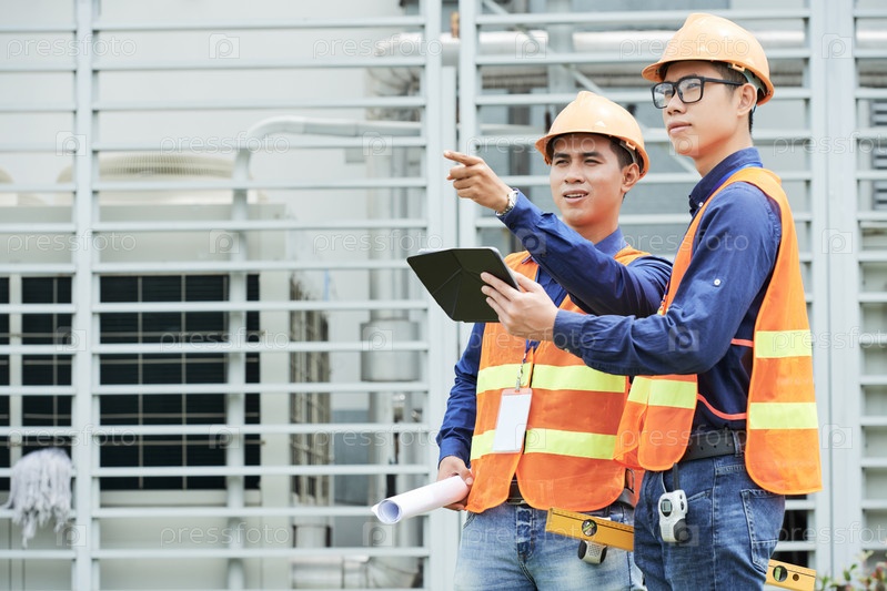 Азиатские инженеры с планшетом смотрят на расстояние