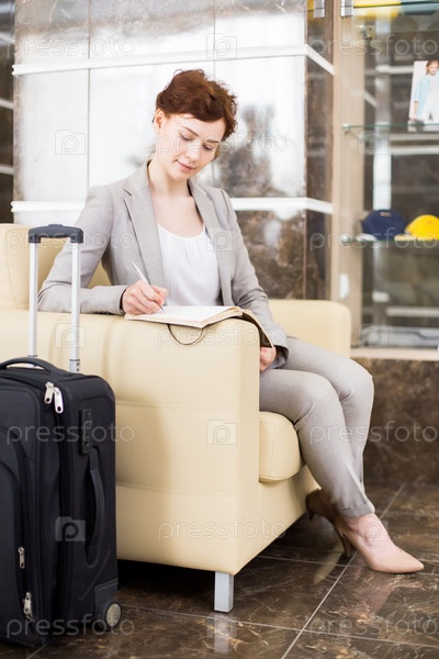 Молодая бизнесвуменка ждет в гостиничном лобби