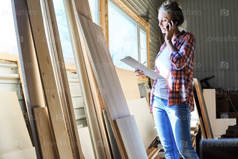 Руководитель женской столярной фабрики разговаривает по телефону